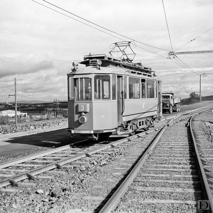 M 5 van het normaal spoornet van de LKAB. De tramweg is hier zwaarder uitgevoerd dan de spoorlijn; de. tram heeft nl. een kettinglijntje, de trein enkelvoudige ophanging! Let overigens op het marginale beugeltje!