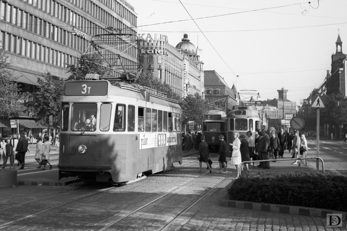 Mannerheimintie (Mannerheimvägen) bij Aleksanterinkatu (Alexandersgatan) tijdens het middagspitsuur. Vlnr: Lijn 3 T, emr. 329, lijn 5, lijn 7 en nog een vierasser. 30 augustus 1967.