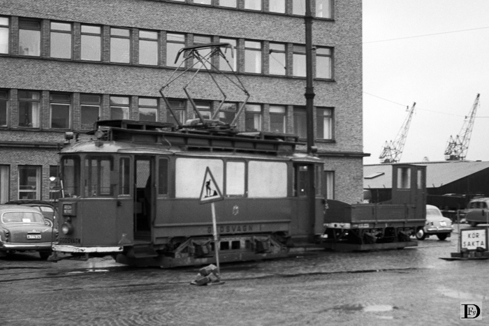 Godsvagn 1 met aanhangwagentje op het speciale opstelspoor voor goederentrams.