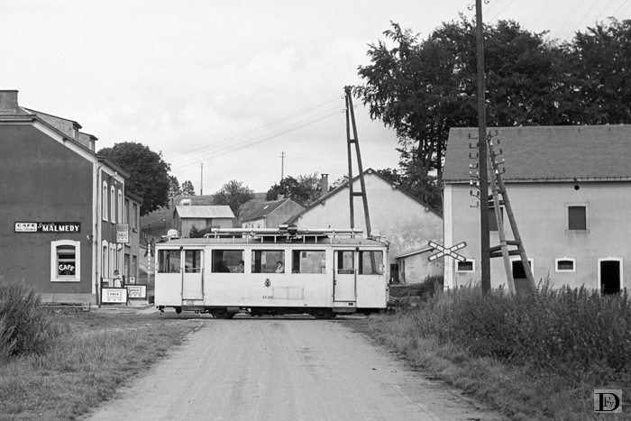 Tram Martelange - Bastogne steekt te Assenois een weg over. De tram rijdt naar links !