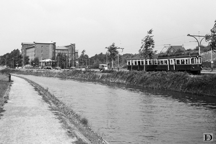 De Dr Plesman weg gezien vanaf de Koninginnegracht met links het KLM-gebouw en rechts een tramstel van de dienst Scheveningen - Voorburg op de laatste dag van exploitatie, zaterdag 31 augustus 1957 !