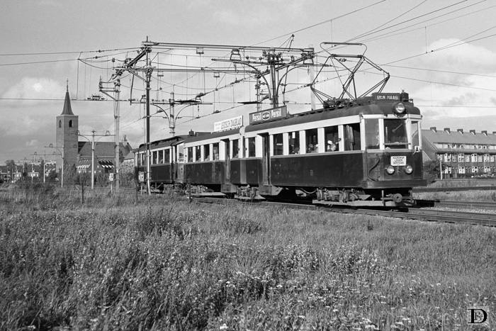 Tram Noordwijk - Leiden - Den Haag op de spoorwegkruising bij Tuinstadwijk te Leiden. De NZH tramweg Leiden - Den Haag kruist (of eigenlijk 'snijdt' !) hier de NS spoorweg Leiden - Woerden.