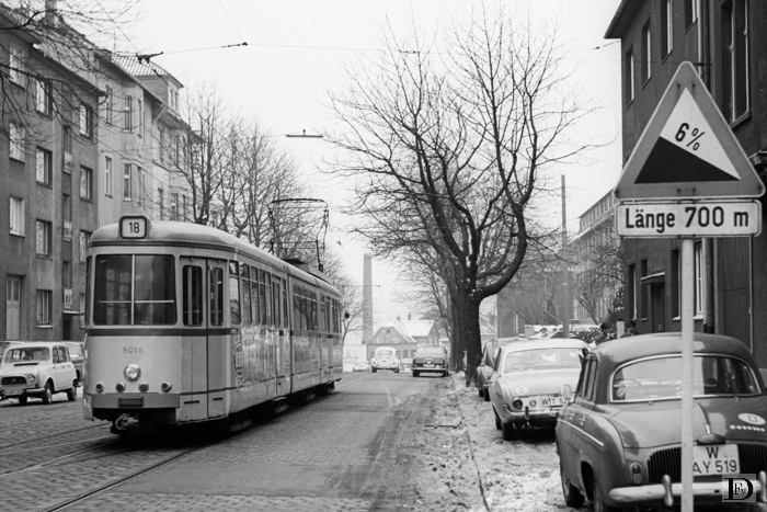 Wupertal Langerfeld, Schwelmerstrasse met dubbelgeleed emr. 8016 op lijn 18 uit Schwelm.