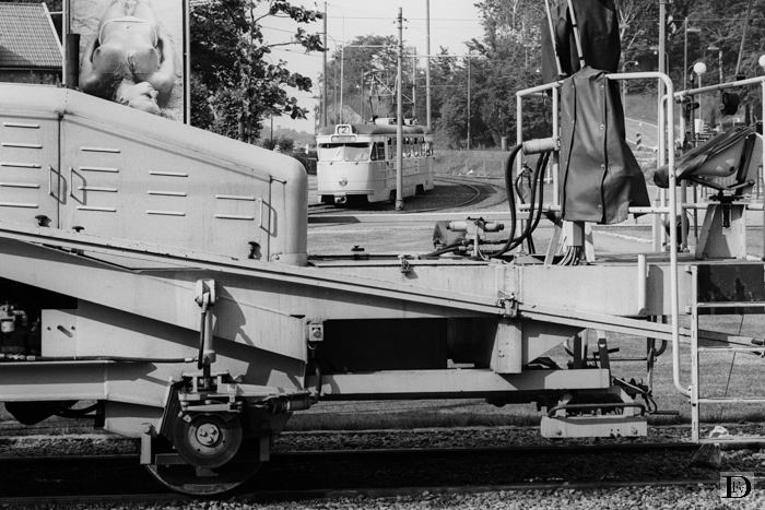 Voertuig voor machinaal baanonderhoud, in huur bij G.S. "Door" het apparaat heen een tramstel op lijn 2.