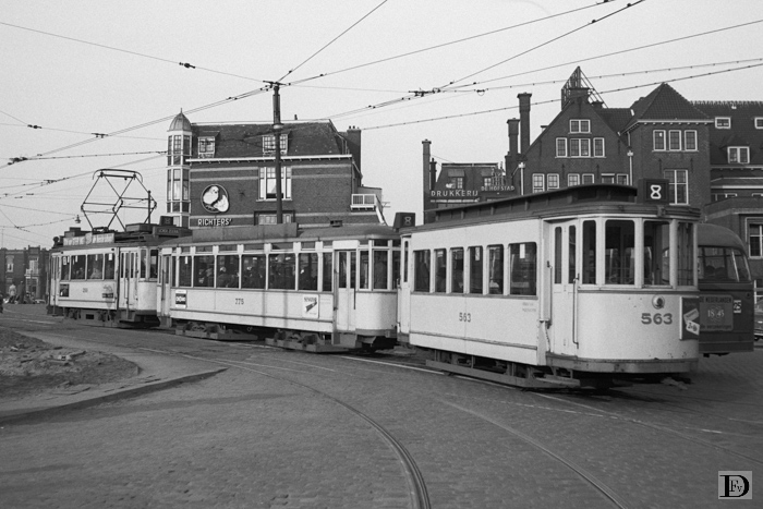 Dubbel spitsuurstel op lijn 8 op het Rijswijkseplein op donderdag 4 april 1957, ca 17.20 uur.