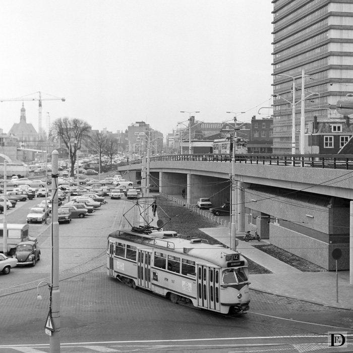 Korte Rijnstraat vanaf tramstation Den Haag Centraal. Beneden een driehoekende lijn 12 (1167), boven een proefrijdende PCC-car (1322).