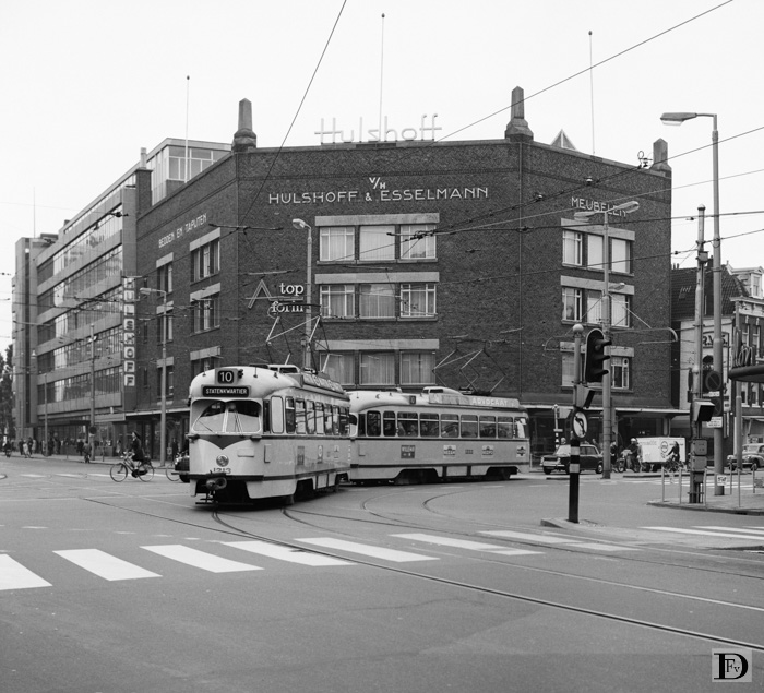 M.u. PCC trein op lijn 10 (1213 + 1222) rijdt van het Spui de Grote Marktstraat in.
