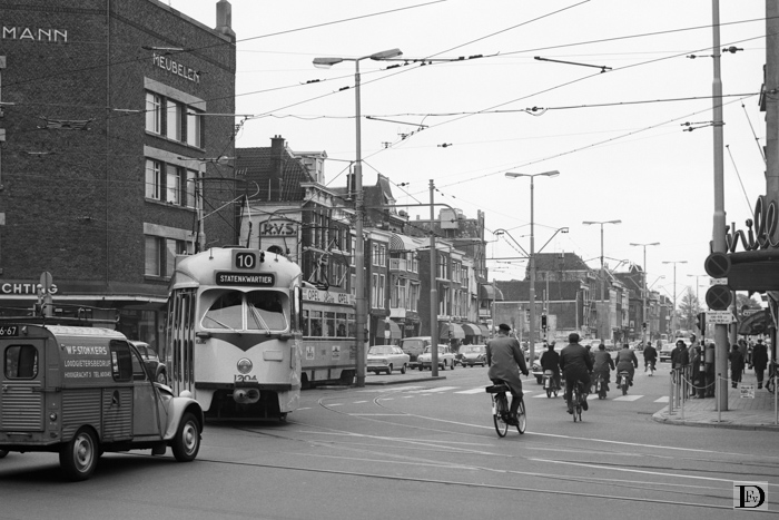 Een m.u. PCC trein rijdt van het Spui linksaf de Grote Marktstraat in.
