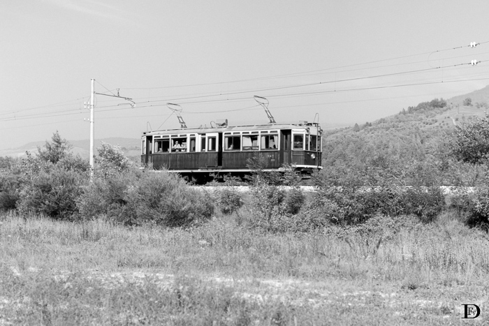 De gereconstrueerde tramweg TRENTO - MALÉ juist ten zuiden van het stationnetje Denno, ongeveer halverwege Clés en Mezzolombardo.