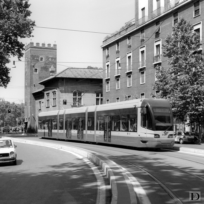 9107 rijdt over de brug richting Argentina; op de achtergrond in de Via Arenula de 9128 richting Casaletto.