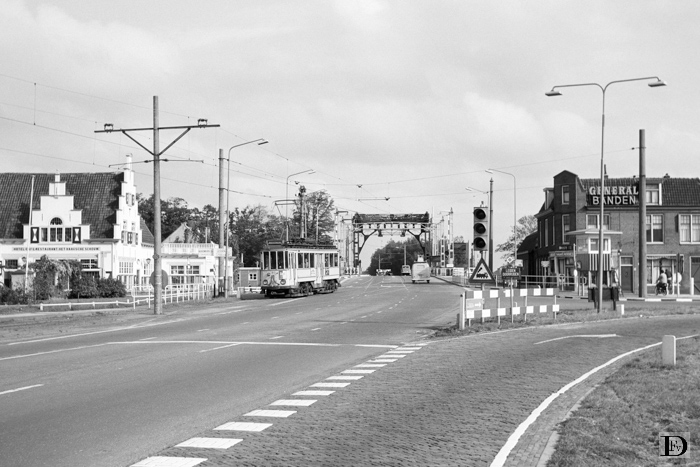 Het kruispunt van de Rijndijk met Rijksweg 4 bij het Haagsche Schouw met IL. 80 op de tramdienst Leiden - Wassenaar - Den Haag (de film staat ten onrechte op „Wassenaar”).
