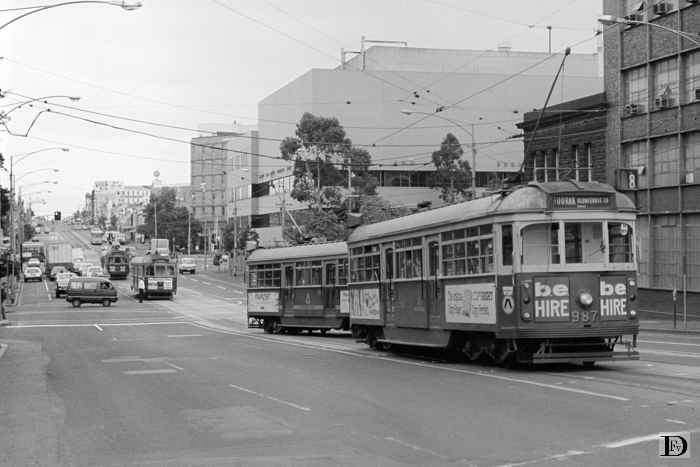 Lijn 8: 987, op het overloopwissel de 984 en in de verte daar achter lijn 72: 843 en lijn 67. Daarachter links een Elizabeth Street tram, die Victoria Street oversteekt bij Victoria Market.