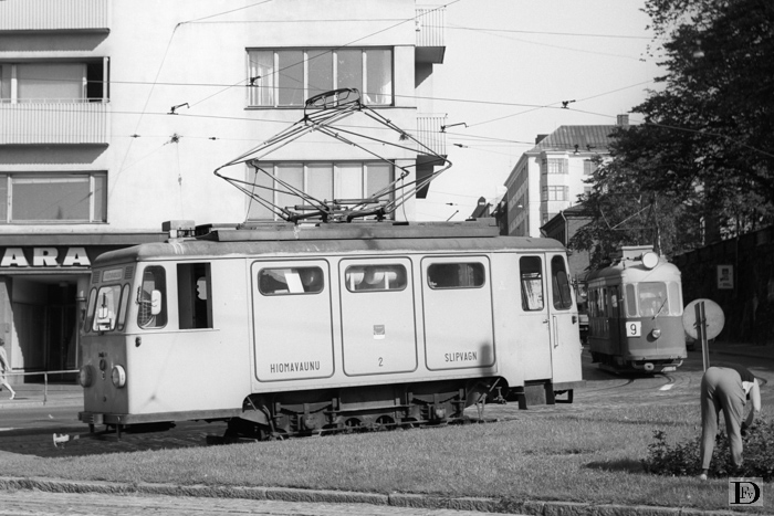 Hiomavaunu, Slipvagn, no. 2, rijdt van de Unioninkatu (Unionsgatan) de Liisankatu (Elisabetsgatan) in. Rechts (in de Liisankatu) een twee-assig motorrijtuig op lijn
