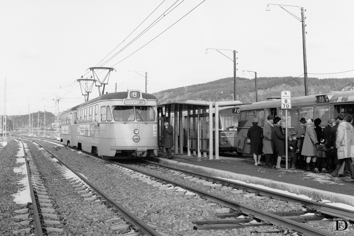 Lärje, Alelyckan, voorlopig eindpunt van lijn 8. Alle reizigers stappen hier over op buslijn 70. Het linker spoor is wel G. S. maar wordt nog niet gebruikt omdat er nog slechts één tramstel op lijn 8 dienst doet, dit i.v.m. het nog niet gereed zijn van de enkelspoorbeveiliging. Het linker spoor is nog niet van bovenleiding voordien.