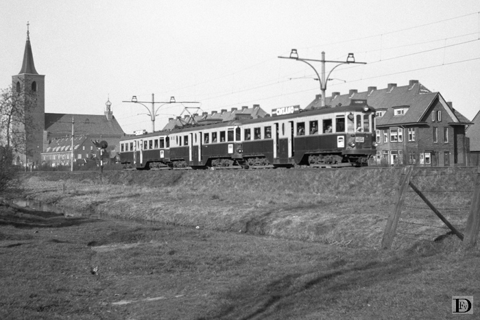 Een tramtrein Leiden - Den Haag langs de Lammerschansweg te Leiden, vlak voor de kruising met de spoortrein Leiden - Woerden.