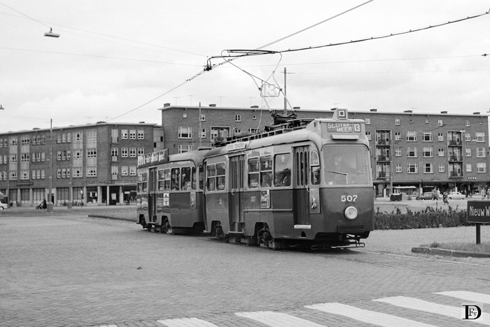 Het begin van de Burgemeester de Vlugtlaan bij het Bos en Lommerplein met een drie-assig tramstel op lijn 13 richting „Nieuw West", zoals het richtingbord op straat ook aangeeft !