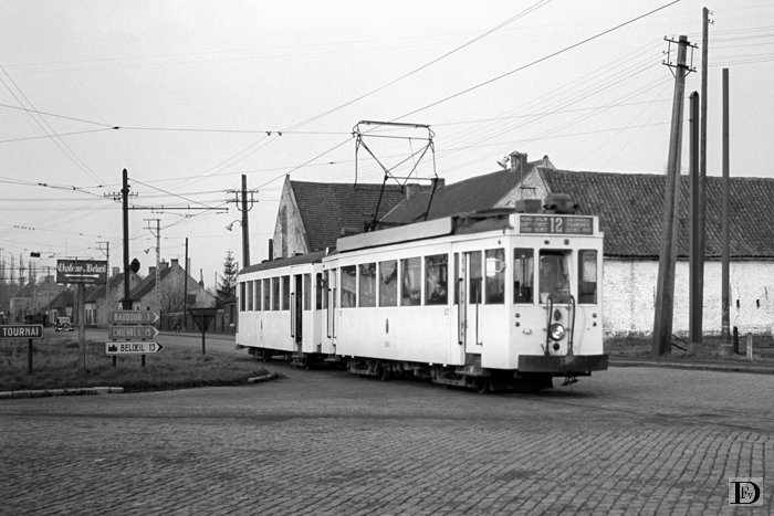 Tertre, de tramweg tussen Tertre en St.- Ghislain kruist hier de straatweg (Mons -) St.-Ghislain - Tournai. Lijn 12, emr 10.355 met ahr. Zaterdag 5 april 1958.