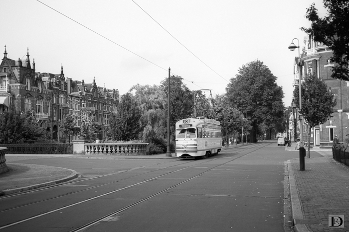 De Waldeck Pyrmontkade vanaf het Sweelinckplein met lijn 10 richting stad. PCC-car 1015. Zondag 21 september 1958.