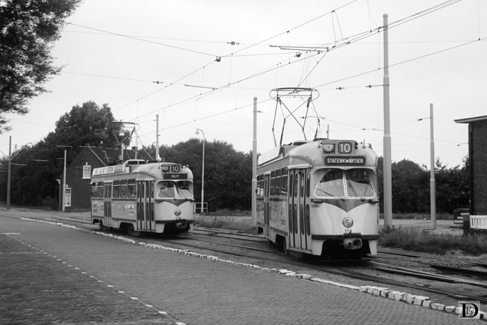 Rechts PCC-car 1212 op de tussendienst tijdens terugzetten naar de beginhalte op de voormalige remise-uitrit, links PCC car 1223 op de doorgaande dienst naar Delft.