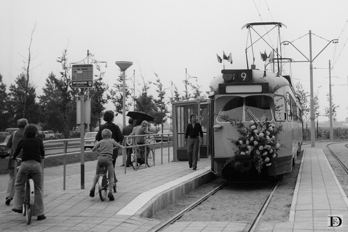 Na de officiƫle opening reden de voor de openingsrit van Vrederust naar de Koninklijke Schouwburg gebruikte tramstellen in een kwartierdienst terug naar Vrederust ten behoeve van de genodigden die daar hun auto hadden staan. 1309 + 2103 na terugkeer te Vrederust, gereed om in te rukken.