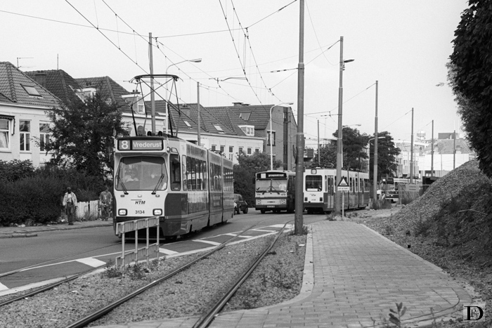 Op de voorgrond lijn 8: 3134, daarachter een bus Hollands Spoor - Zuiderpark voor "Parkpop" (473) en in de verte een extra tram voor "Parkpop" vanaf het Centraal Station. Naast de bus rijdt in de andere richting een lijn 9: 3138.
