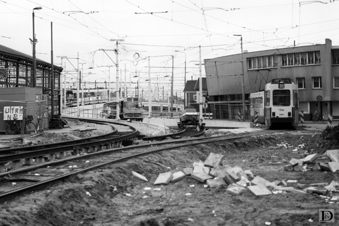 De aansluiting van het Stationsplein op de Parallelweg met de vrije trambaan van lijn 11 langs de Parallelweg en de tijdelijke trambaan in de Parallelweg. De trams richting Hollands Spoor rijden al over de fly-over, vanaf het Hollands Spoor wordt nog via de tijdelijke sporen gereden. Er wordt nog gewerkt aan de sporen. Ongeveer twee weken voor de indienststelling van de tramtunnel Hollands Spoor. Rechts rijdt lijn 11, 3105, weg richting Scheveningen; links in de verte rijdt lijn 12 de fly-over af richting beide hoofdstations.